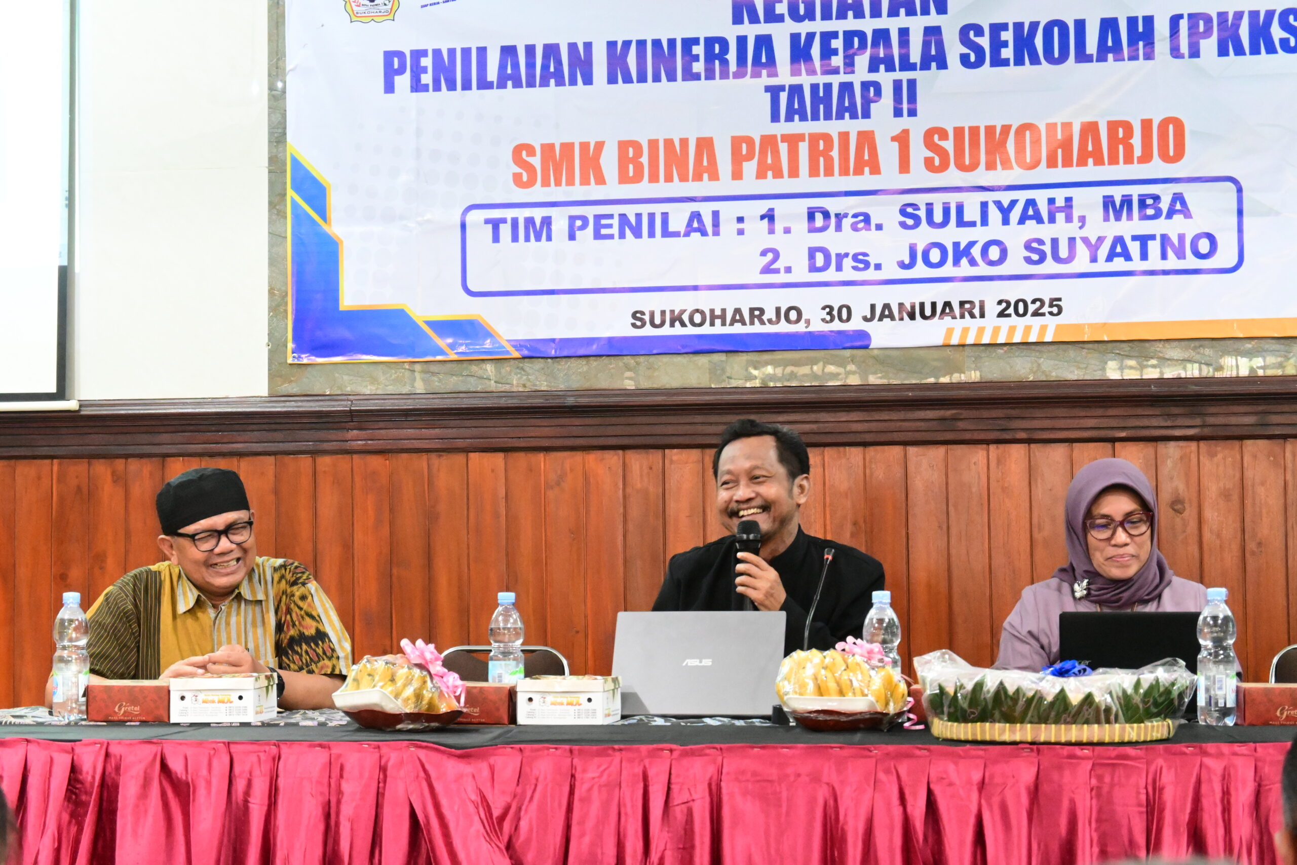 Penilaian Kinerja Kepala Sekolah (PKKS) Tahap II oleh Bapak Drs. Joko Suyatno dan Ibu Suliyah, S.Pd., M.B.A. dari Cabang Dinas VII pada hari Kamis, 30 Januari 2025 di Aula SMK Bina Patria 1 Sukoharjo.
